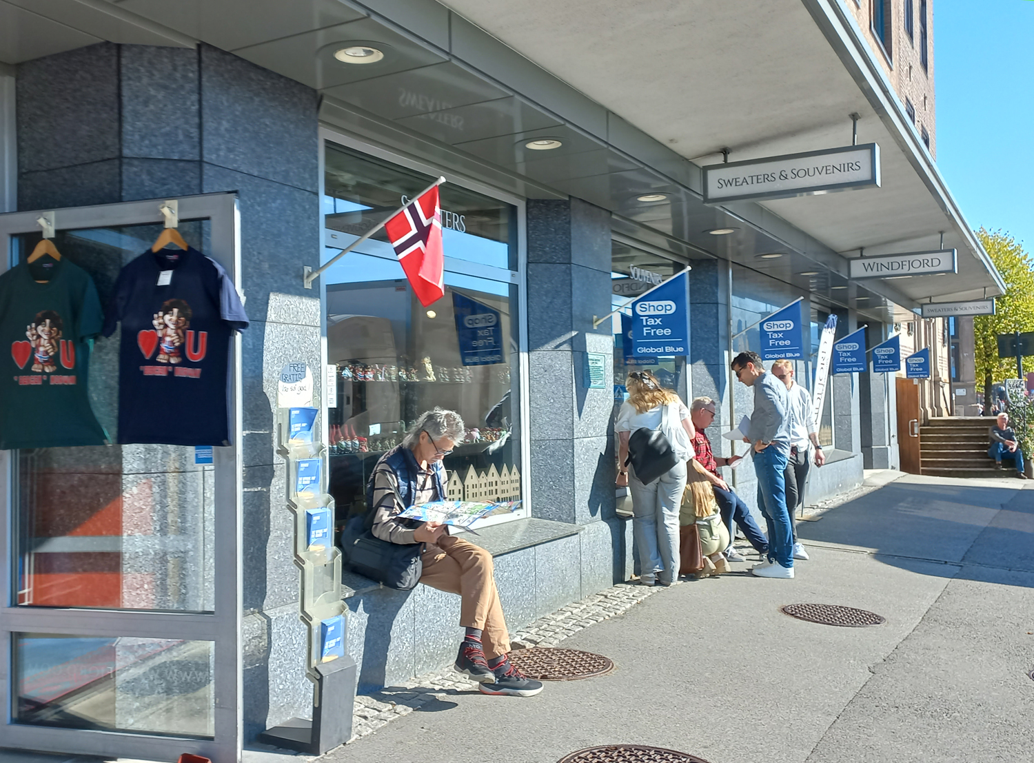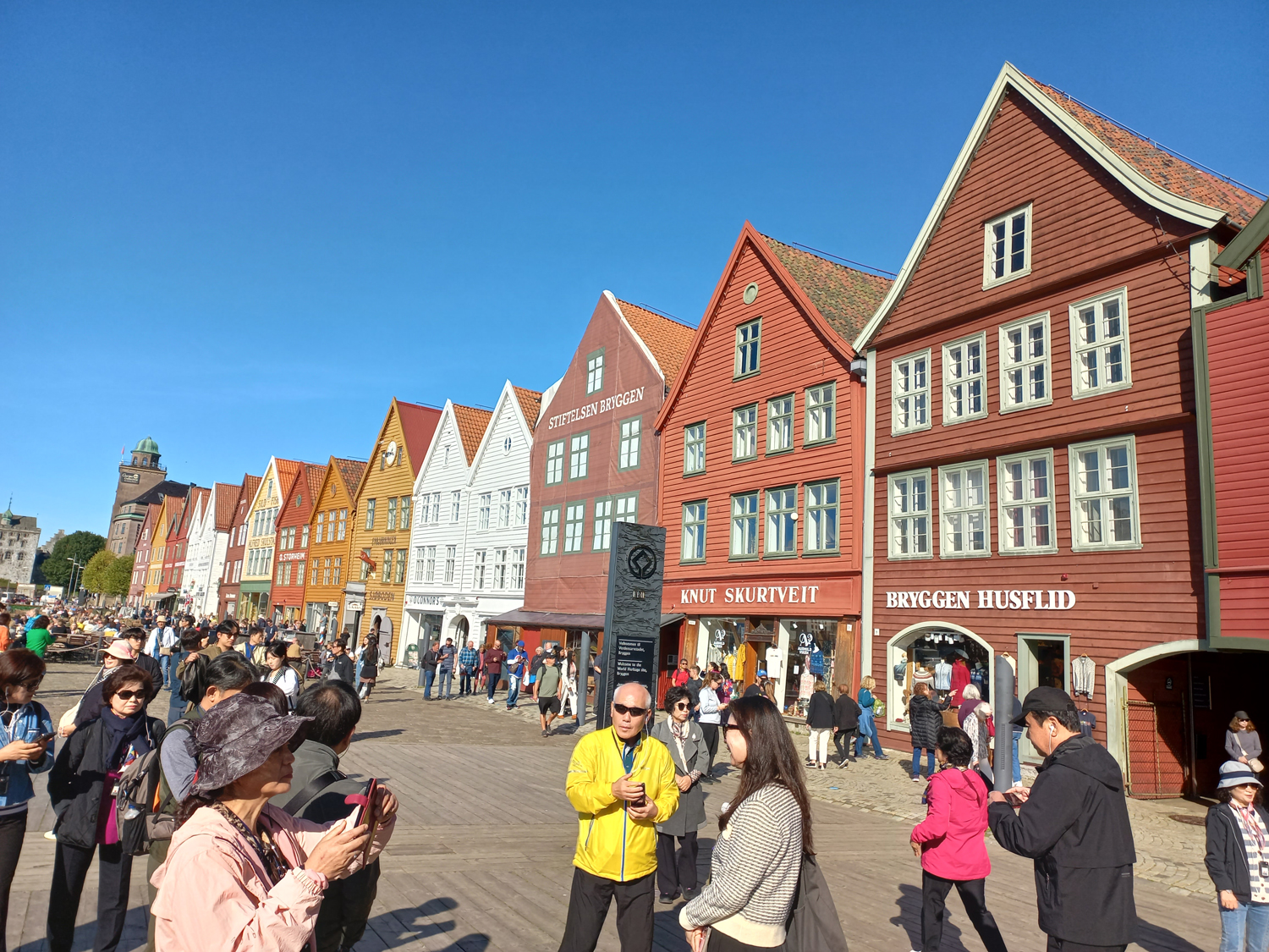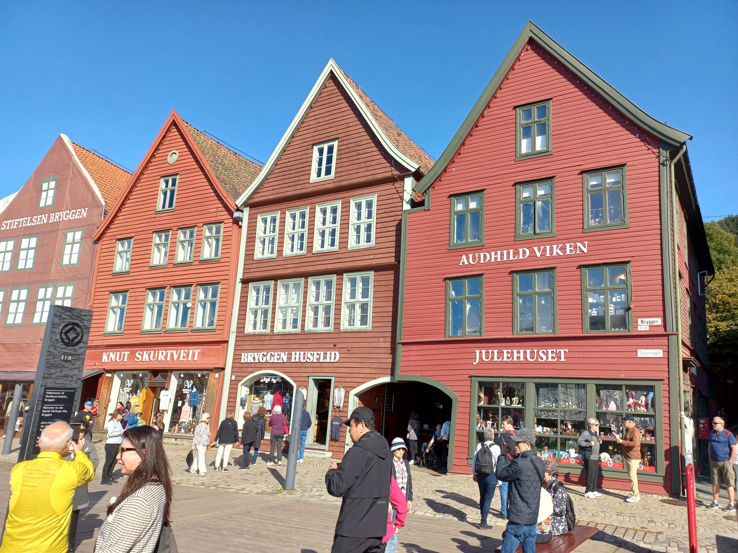 관광객이 모여드는 베르겐 역사지구의 중심 - 유네스코 세계문화유산 등록표지가 세워져있다.